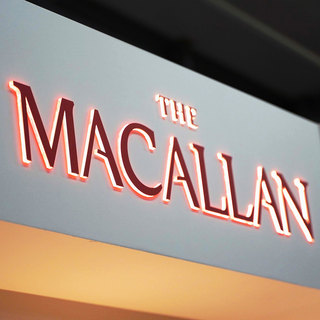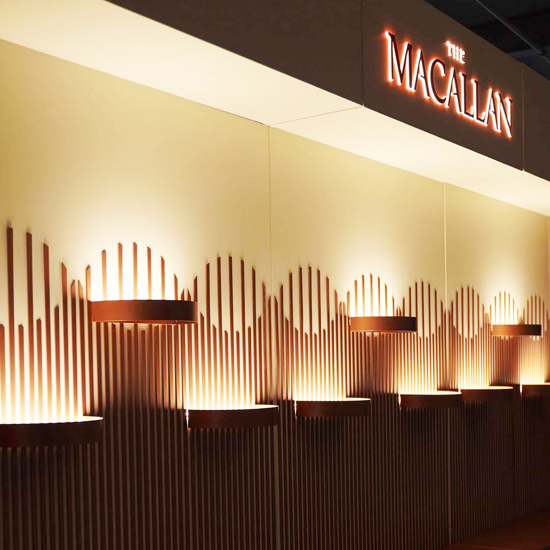 Opływowy, zaokrąglony bar przyciąga wzrok podświetlanym, geometrycznym reliefem na froncie, stanowiąc wizualne zaproszenie do świata The Macallan.