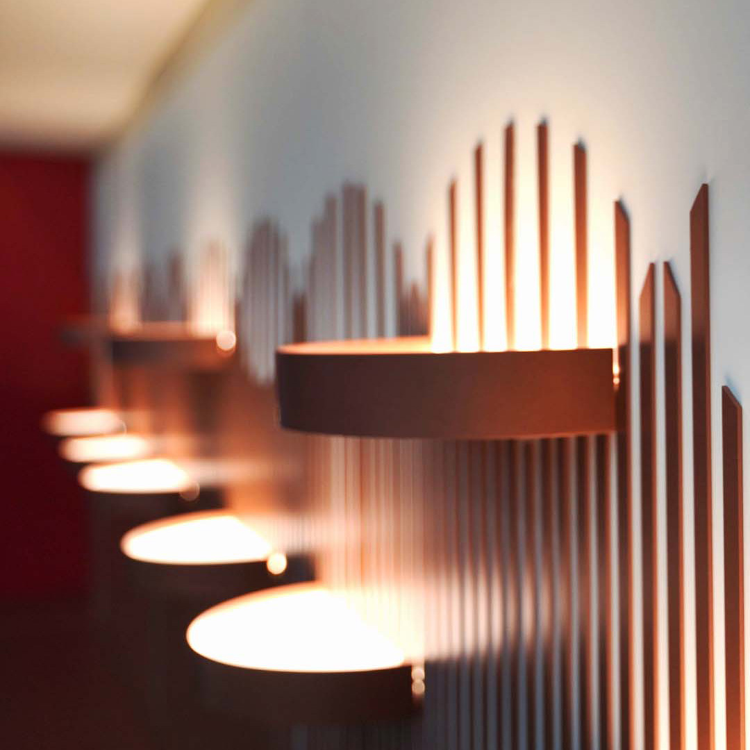 Ściana ekspozycyjna – charakterystyczne miedziane fale stanowią szlachetne tło dla butelek, a indywidualnie podświetlone glorifiery podkreślają wyjątkowość każdego eksponatu. Całość zwieńcza kaseton z logotypem w kolorze czerwonym, który dominuje nad przestrzenią.